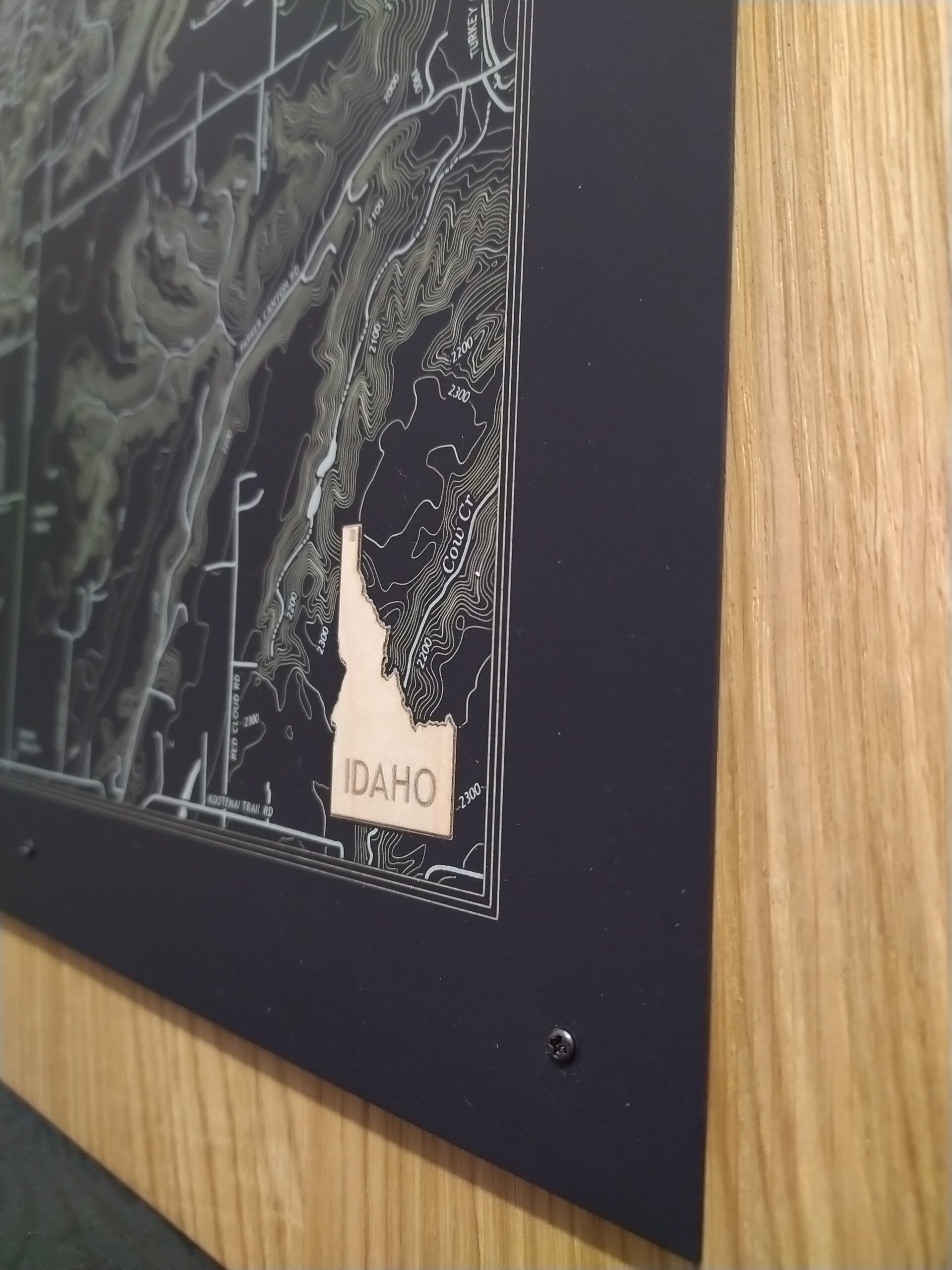 The next step is to engrave the metal panel. I use 2 different engraving techniques with each map. The first part engraves all the text and features using a standard “scan” process similar to regular printing. The second traces each topographical line individually for stunning results.