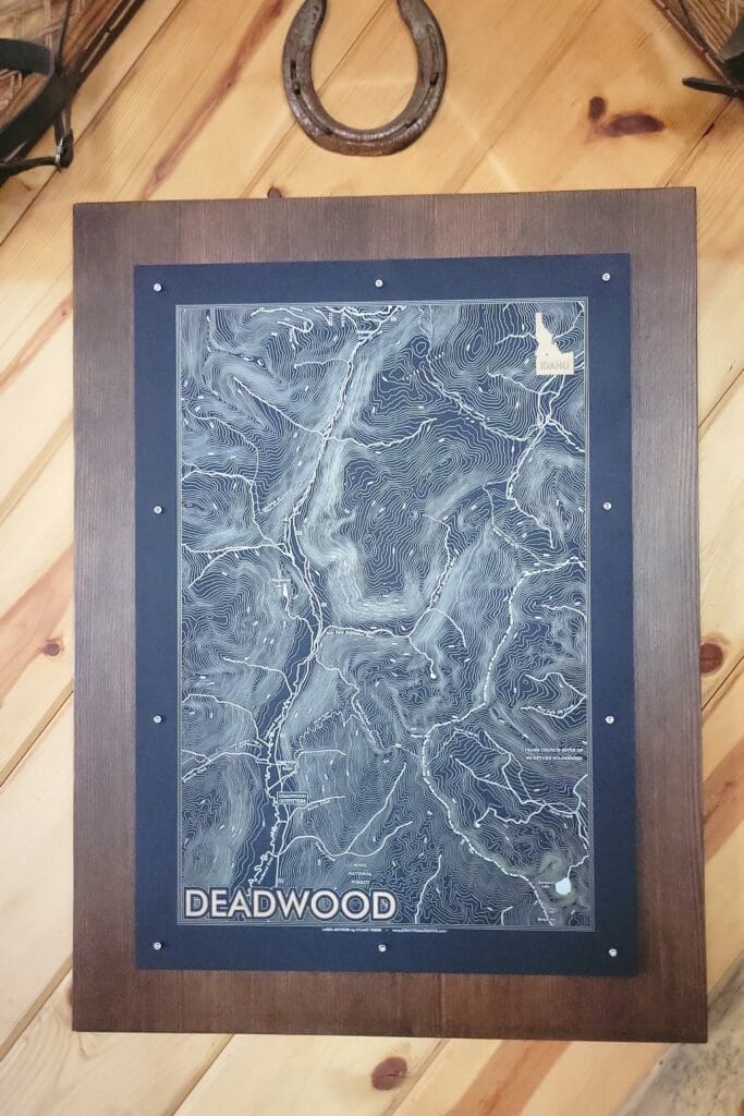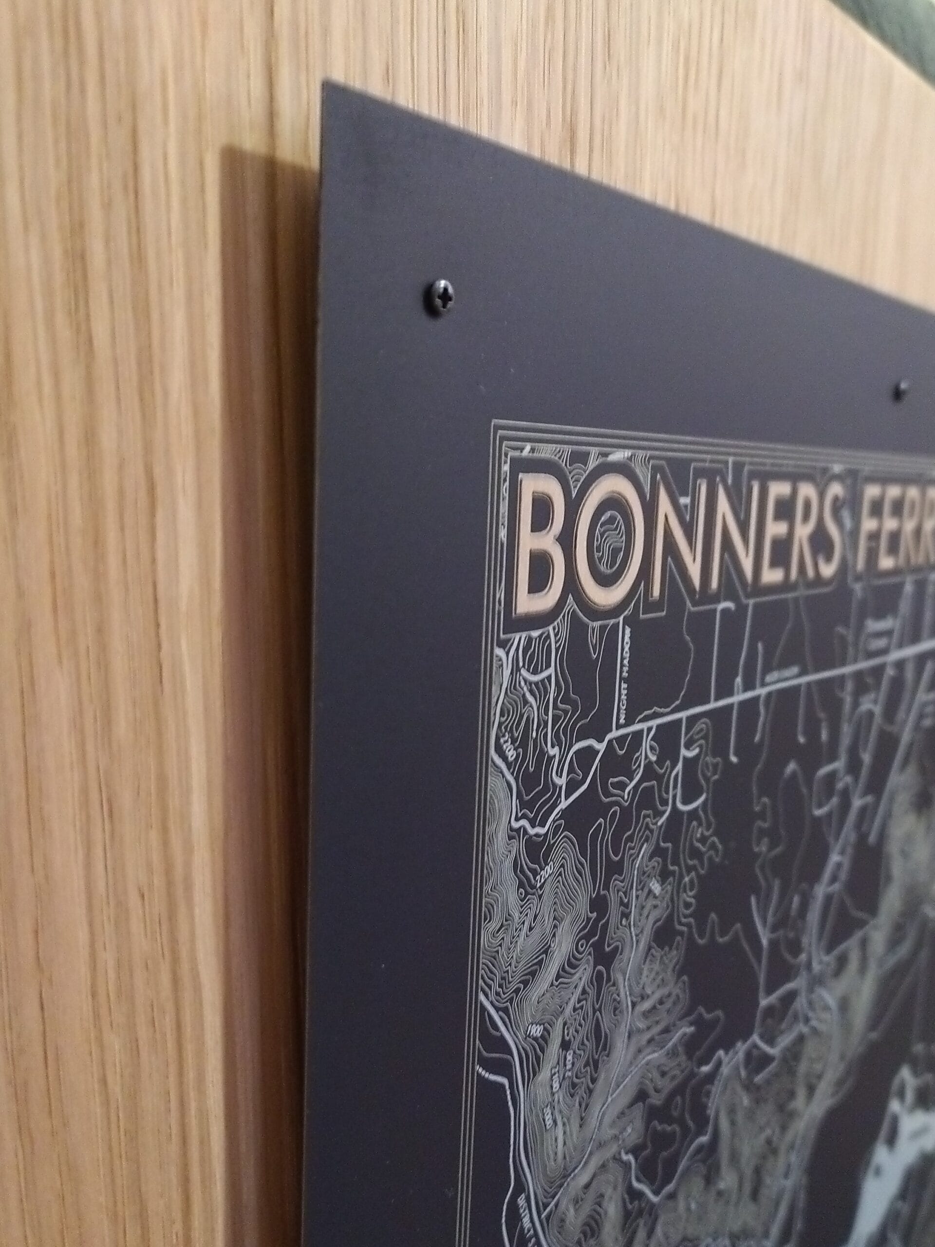 The frame panel is sanded, edge banded, lacquered, and hanger installed. The map panel and standoffs are then pre-drilled and mounted to the frame with both screws and adhesive.